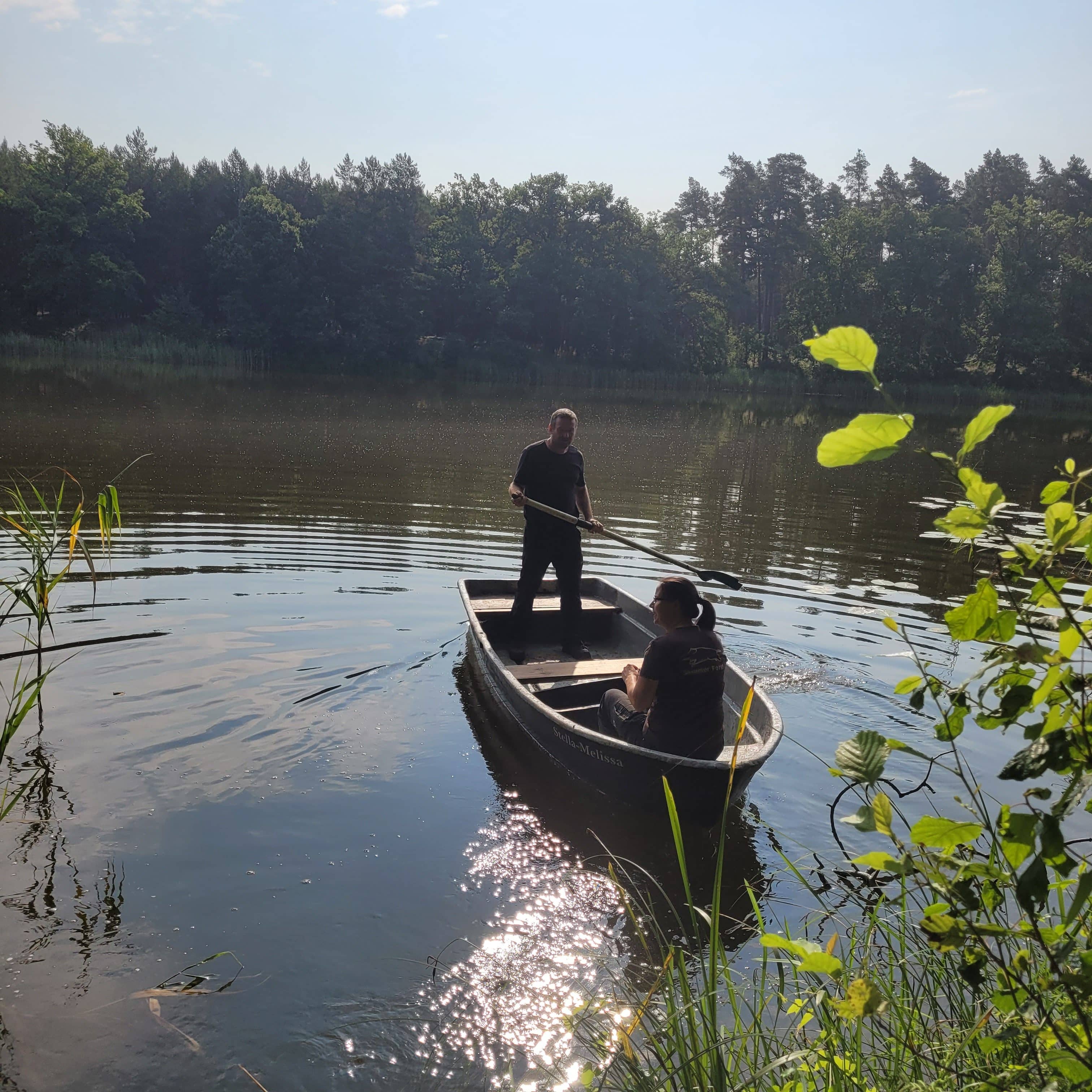 Am frühen Abend trafen sich angelinteressierte und bereits -begeisterte Kinder am Sauener See. Fokus der Veranstaltung lag auf der Wissensvermittlung und -vertiefung rund um das Thema „Angeln“. Neben allgemeinen Fragestellungen, in welchem rechtlichen Rahmen Angeln (auch bei Nacht) erlaubt ist und wie man sich in der Natur zu verhalten hat, galt das Interesse vor allem der verschiedenen Angeltechniken. Während eine Gruppe vom Gewässerrand aus die unterschiedlichen Angelutensilien ausprobierte, war eine andere Gruppe in Begleitung mit dem Boot auf dem See unterwegs, um dort ein Stellnetz zu testen.